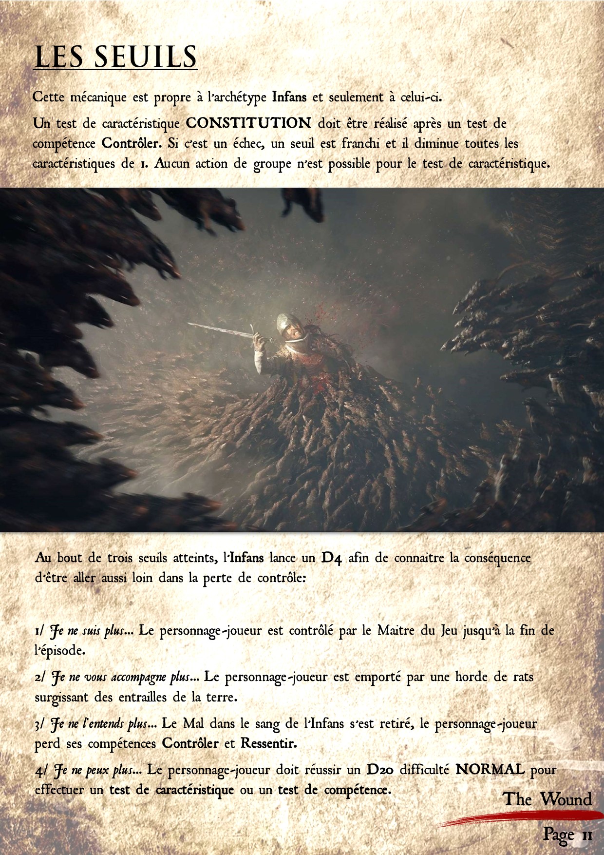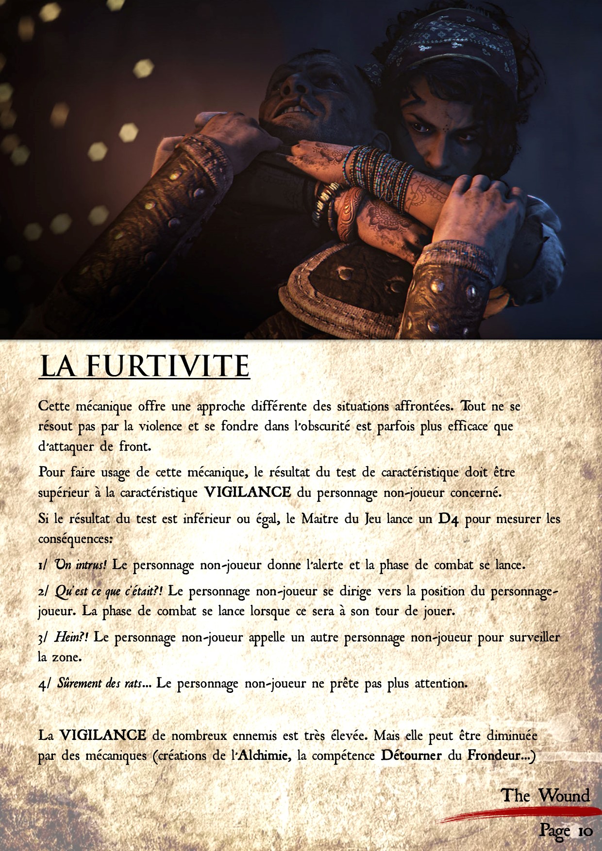 Les caractéristiques dans The Wound sont assez classiques, même si les appellations sont différentes. Cependant, il y a une mécanique propre à ce Jeu de Rôle et essentiel dans l'univers A Plague Tale: l'infiltration. Celle-ci est représentée par deux éléments: la VIGILANCE, caractéristique présente chez les PNJ adverses et la FURTIVITE, caractéristique présente sur toutes les fiches de personnages des joueurs.ses leur offrant la possibilité de se dissimuler dans les ombres.